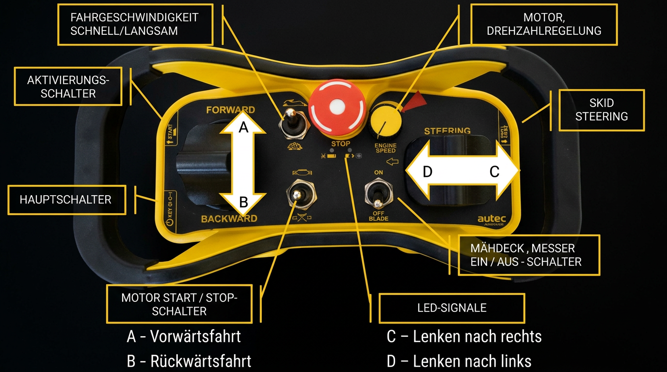 - Nach dem Motorstarten überprüfen Sie die Funktionsfähigkeit des Notausschalters auf der Fernbedienung. Diese Funktion sollte mindestens 1x pro Arbeitsschicht überprüft werden, immer aber wenn Sie mit dem Rasenmäher auf eine andere Mulch Fläche übergehen.
