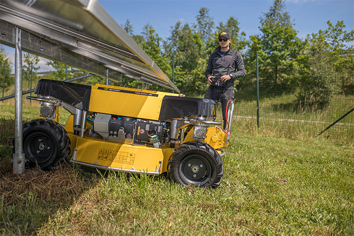Mit einer Bauhöhe von nur 82,5 cm pflegt er Flächen unter Paneelen effizient, wo Traktoren nicht hinkommen.